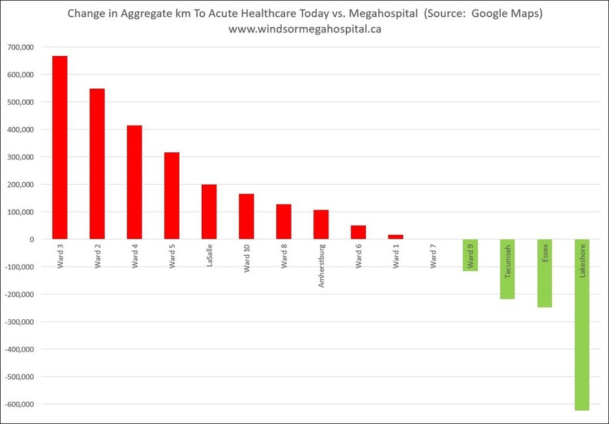 The other issue is that their measurements (this hold true for all of their calculations) calculates to the nearest Hospital while at the same time they fail to account for the alternative sites that will be developed as a part of the Mega Hospital plan. The Grace Site, Tayfour site, and Ouellette site will still be medical facilities in the City of Windsor, will still be staff by hospital staff and still play a roll in their neighbourhoods and communities. True not every service is offered at each site but today with the two hospital sites certain facilities are prioritized for certain procedures (Met having the Cancer Centre for example). Some long term care and surgical recovery and rehab already occurs at the Tayfour site, meaning that daily visits to the Mega-hospital may not be required to see a recovering family member.