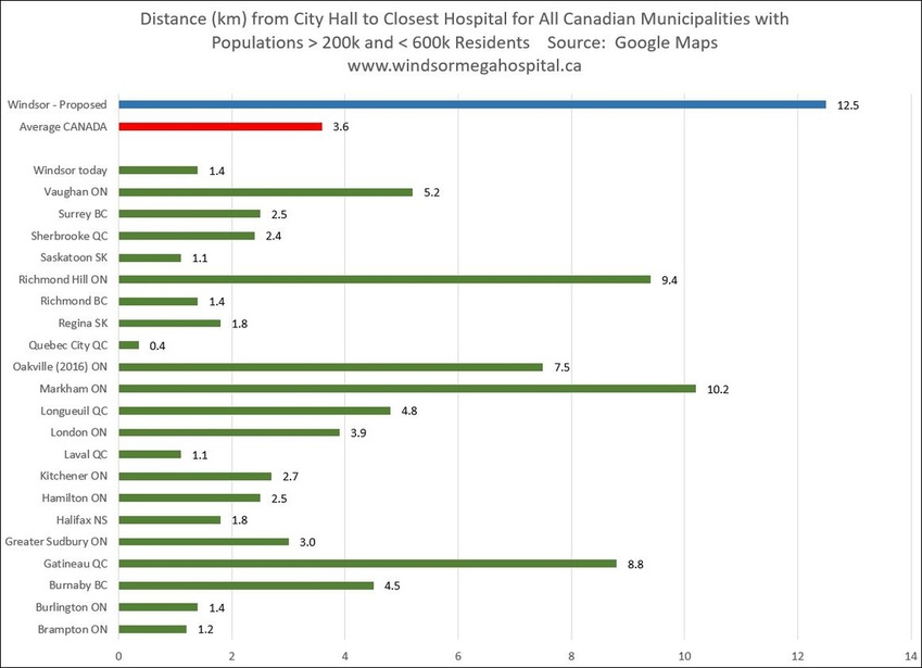 City Halls are a potential measure for the centre of a city but not the measure for where people live in the City. In the case of Windsor, City Hall is at the extreme north end of the City meaning that almost everyone in the city (except for a small portion of people living on Riverside Drive) actually live closer to the new hospital site than the City Hall! From a planning standpoint many of the communities listed are not on bodies of water/or a border which in turn allowed for a circular development pattern around a city centre. As a result they likely haven’t had the singular directional of sprawl that Windsor has faced which in turn has enabled a more even development pattern and compact urban centre thus lowering the distance to the Hospital.