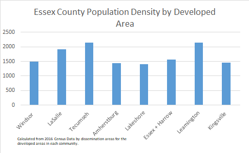 In many ways the smaller municipalities of Essex County are actually better placed to develop more compact, urban communities than Windsor is. When you look at 2016 population density data for the developed areas of each municipality you see that in many cases these communities are denser from a population standpoint then Windsor.