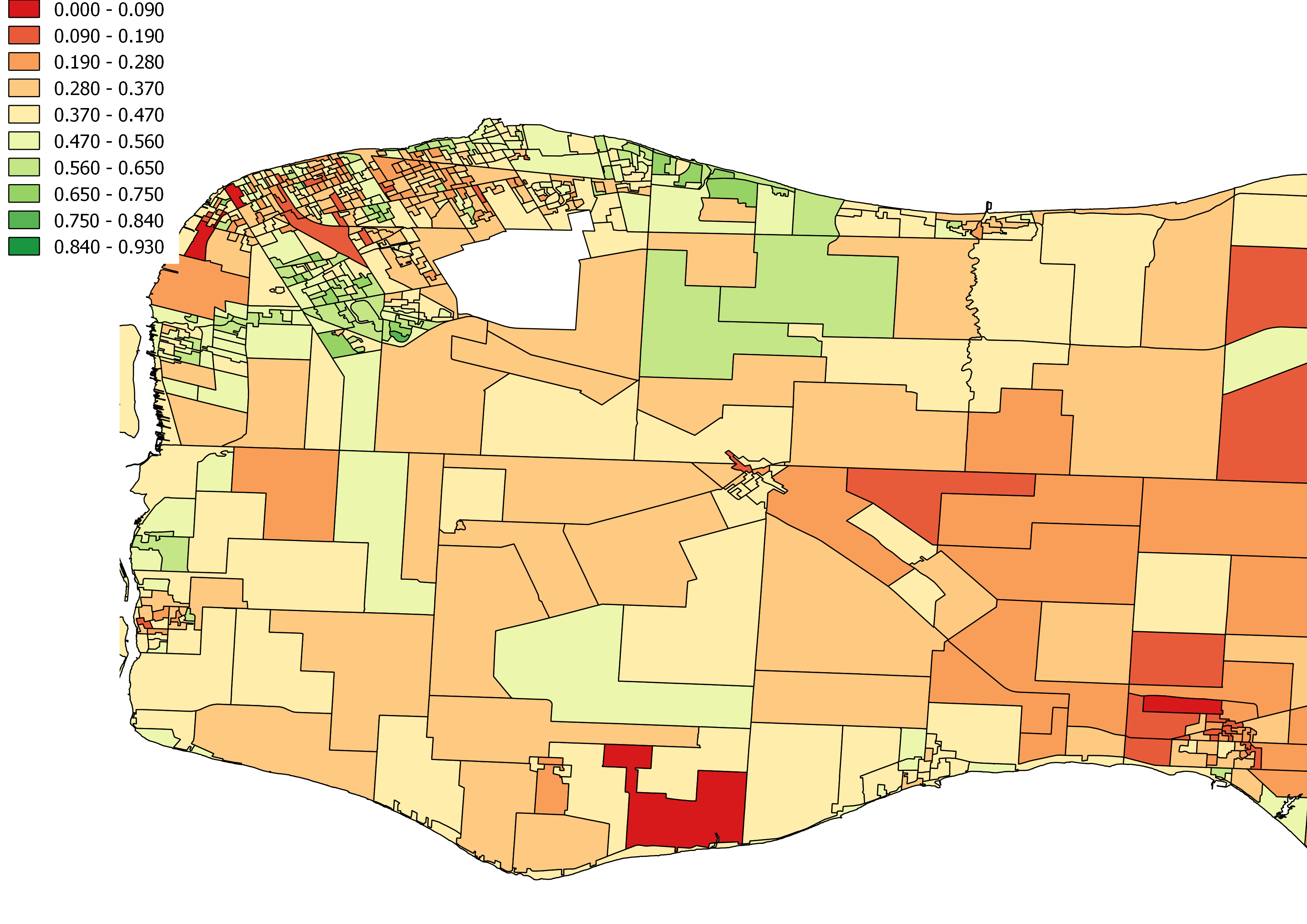 The map on the left shows the portion of the population with a degree above a BA while the map on the shows the total number of degree holders. Given that a post-graduate degree in our community is worth almost $17,000 per year compared to a BA in average wages ($98,700 vs $81,800) in the Windsor CMA. The presence of these concentrations of higher income degree holders creates an pockets of populations where needs are met, there is greater disposable income and in turn greater time to access community amenities and advocate for services. Unsurprisingly Old Walkerville and near the University are home to higher rates of post-graduate degrees (as a percentage) but from a raw number standpoint more live in Wards 1, 7 and 10 than the core (green map). These higher totals spill over into LaSalle and Lakeshore.
