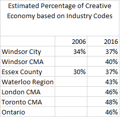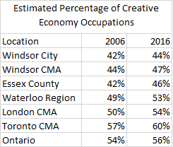 What can be taken way is that due to the greater precision of the 20 categories, the actual “creative” levels in our economy decline from the 10 occupational categories. Our region in 2016 still lags Provincial and peer communities.