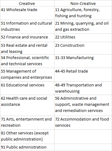 If we were to group these categories using Florida’s rough guidelines of creative vs non-creative employment sectors: we would find the first six categories (Management through Art, Culture and Rec.) generally aligning with the creative class and the last four generally do not.