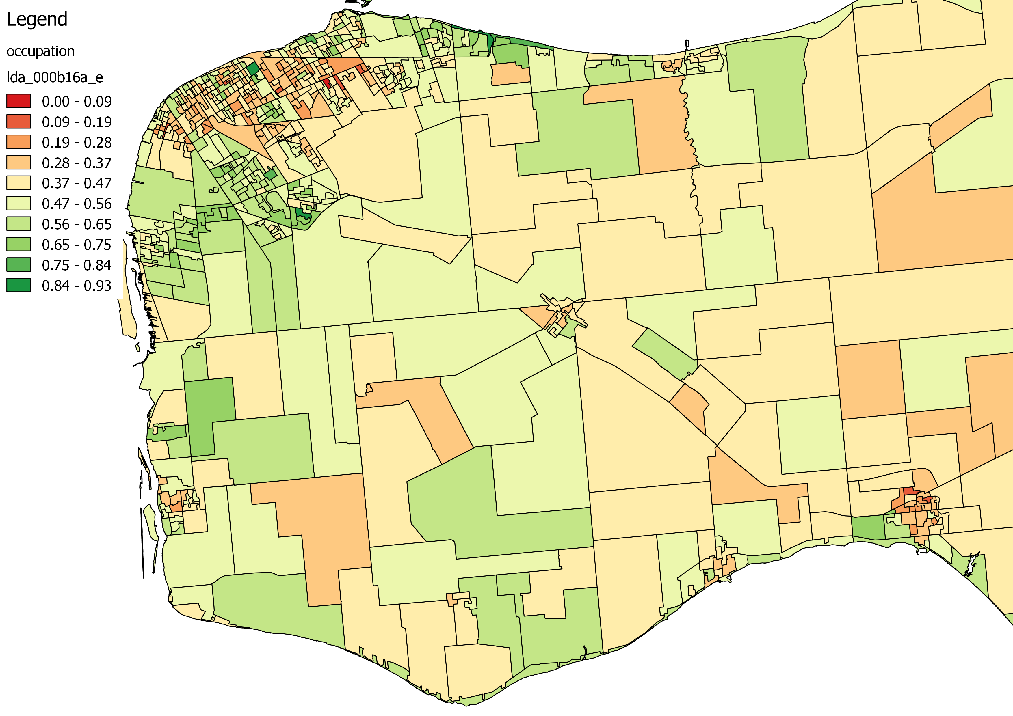 Based on Florida’s arguments, the “Creative class” when in significant concentrations will drive urban revival. Growth of “creative” clustering outside of the city core has an important impact. From the Occupation data we find that in 2006, there is only 1 DA had greater than 75% concentration of creative employment, compared to 2016 Census DA with a 93%. In other words, the employment homogeneity of our neighbourhoods is shifting.