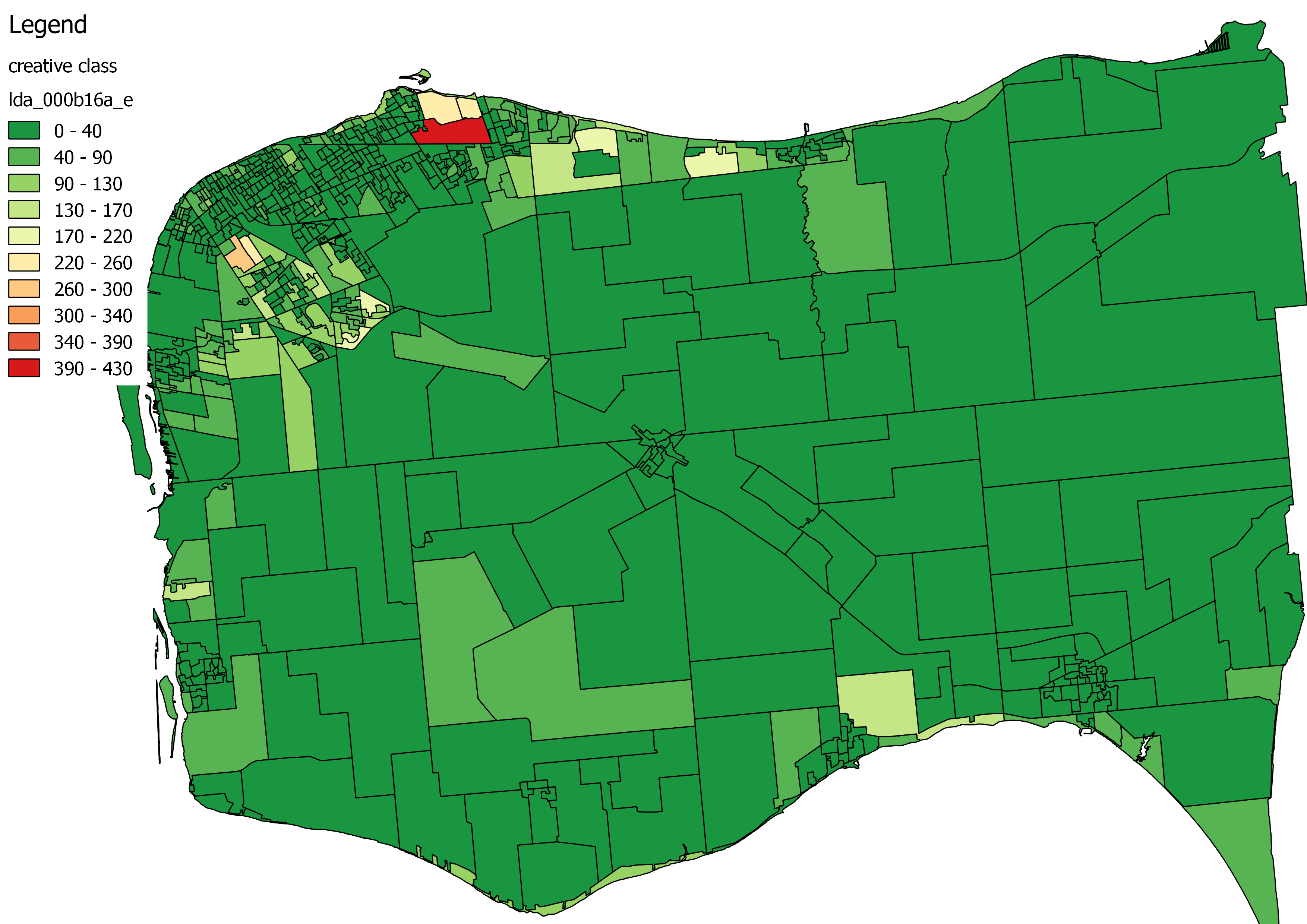 In 2006, only 16 DA in Essex County were home to greater than 2/3 of residents being in a creative occupation, in 2016 that is 44. Of those 44 DA, 21 reside in Windsor with only 5 being in the “Core”, 4 clustered around Walkerville and 1 closer to downtown. The remaining 16 are clustered in Ward 1 in and around Roseland; Old Riverside in Ward 6 and new developments in Ward 10. Contrary to Florida’s prediction, concentration of creative classes have not moved towards the city centre, demanding greater urban services. In fact in 2006, 11 of the 16 DAs with highest concentrations (66% or greater) were in Windsor, 4 in the core. Two of these DAs maintained their “creative” populations (Walkerville) while two lost populations, one near Ouellette Campus and one near the University in ward 2. In other words, there are more “creative” people in Windsor but they are not clustering in the core.