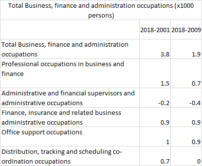 Despite almost equal total sector growth between two time frames. These sectors of all of those that are listed, are probably the least specialized. During the belt tightening of the recessions, admin assistance were a luxury that many companies probably couldn’t afford the supervisor role in these positions were hit, and never recovered, the support occupations have bounced back. Again despite there being latent demand in some of these sectors – like the logistics sector, shortages seem to remain the norm, with no significant growth measured between 09 and 18.