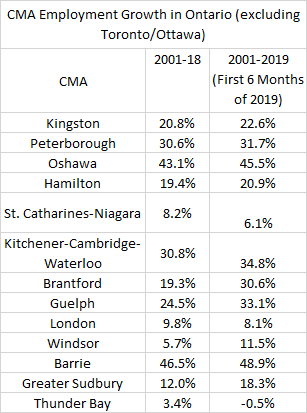 When we compare ourselves to the rest of Ontario (less Toronto and Ottawa) Windsor does find itself in the lower half of pack for employment growth. That being with that partial 2019 data we have outpreformed our comparative communities of London and St. Catherines. The addition of those Toronto and Ottawa metro areas doesn’t change Windsor’s standing that much but they have outgrown most of Ontario. That being said, the recession did hit Windsor hardest Windsor’s employment shrinking by 5.9% between 2001 and 2009. There is some likelihood in softening in the rest of 2019 with pending Chrysler third shift coming to an end. As a 1,000 persons employed equates to a 0.7% variation for percentage in the Windsor CMA could see the average regress back towards to mean over the rest of the year.