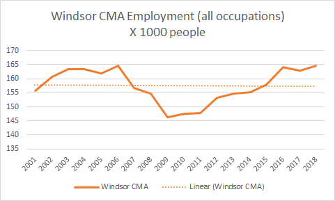 First I am digging into some of the data that was originally posted by Mike Moffatt on SW Ontario manufacturing data and other employment and income data. I have decided to zoom in and unpack the specific context for the Windsor CMA (does not include Essex, Kingsville and Leamington in our region). Looking back 18 years to 2001, provide significant context to how our economy has evolved over the first two decades (nearly). Although there are predictions for the economy (nationally) to continue to pick up steam, moderate or go into recession in 2019 (no one actually knows what’s going to happen). Locally things are expected to moderate.