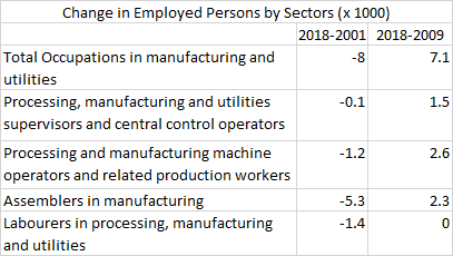 We know that over the long term there has been a decline in this sector. The rise of central control operators in the last decade points to the increasing automation as capital seems to be replacing labour. This automation places additional pressure on assemblers and labourers have in these sectors. As additional education and training are needed for these control positions compared to labour