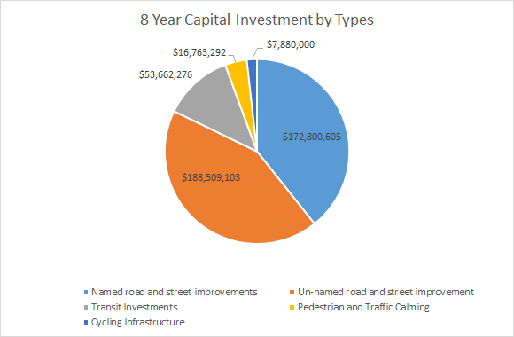 - Unnamed or General Road – things like city wide bridge repairs and pothole fixing. The largest segment of this category is Road Rehabilitation – Various Locations Program at over $112M over the course of the budget;