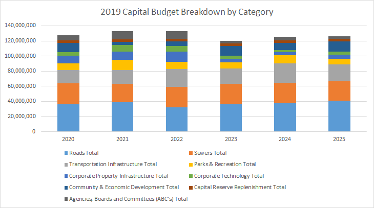 So when we add it all together what do the expenditures look like. You can find the total used to calculate these values in this excel file for download. Below you see the projections from the 2019 capital budget. This was a 6 year budget projection and I didn’t show the 2019 budget that has already been implemented.