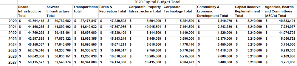 The Capital budget is a complicated beast as it has grown from 7 to 8 years this year and will grow to 9 years in 2021. What I have done is highlight a few projects that caught my eye, as well as compared the 2019 budget to the 2020 and see if new money appeared or disappeared. I have also managed to convert the PDFs that tables have been published into Excel files for both the 2019 and 2020 capital budgets some comparisons to be made. It is likely that I will continue to post about these comparisons after the budget is completed next week.