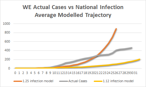 - On the model above I stopped including the 1.25 model as after 25 days the doubling time explodes and it makes the actual line very hard to see. The next 10 days will see the 1.12 infection line converge with the actual.