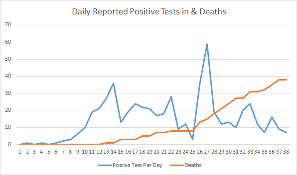 - What is interesting in the chart above (despite 961 pending tests and the timing of those tests) is that we average approximately 14.6 cases per day. The question becomes, what number of new cases per day can our community sustain and be open.