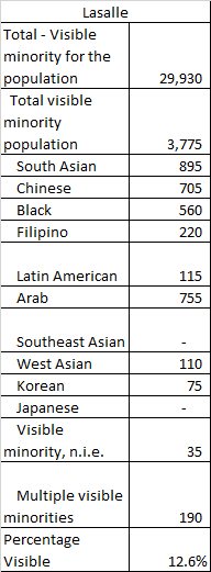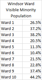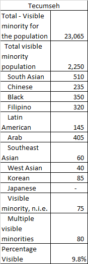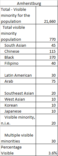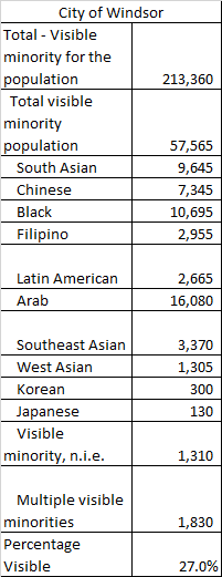 You can clearly see despite the debate/discussion of how diverse the region is, it really only certain communities (and parts of certain communities) are truly diverse. Obviously this was a snapshot in time, and populations have continued to grow but this is the foundation on which that growth occurred. The proportion of visible population varies with approximately 1 in 4 in the City of Windsor identifying as a visible minority to 1 in 50 in Kingsville. Within the City of Windsor, it breaks down like this: