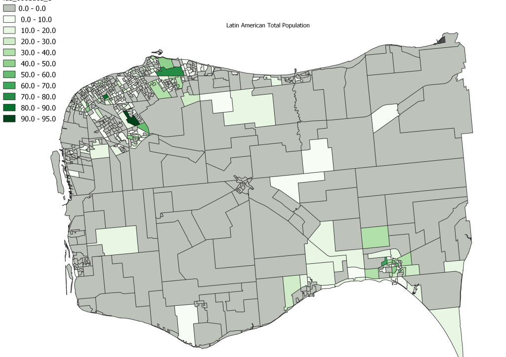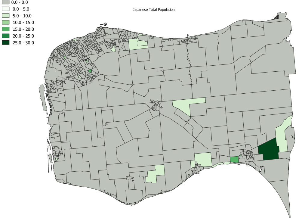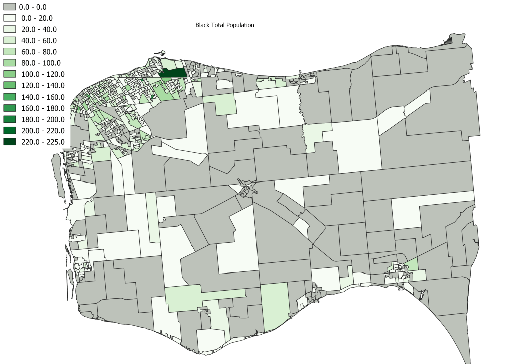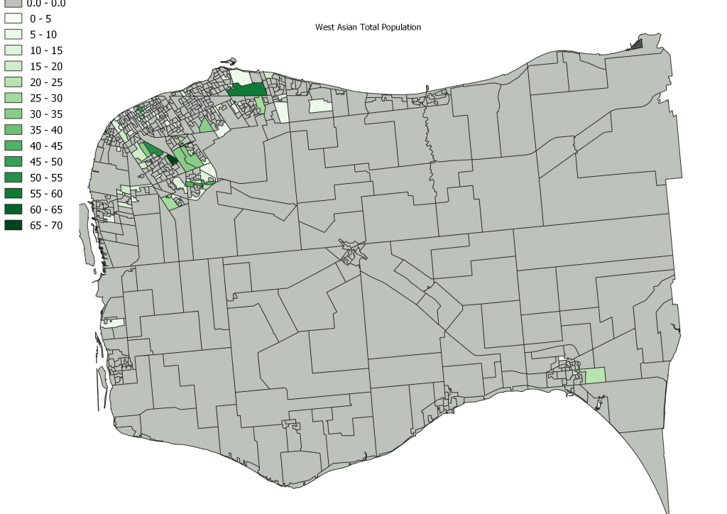 In the gallery below you see each of the visible minority total populations mapped. Unlike the map above this shows the total populations, but as above, grey on the map represents 0 individuals identified with that population. Note that the East Windsor and Division/South Cameron areas do skew the upper end of the data due to their larger population sizes. Think of those ares on the map being divided into 5 to 10 sub-DA after 2021 Census.