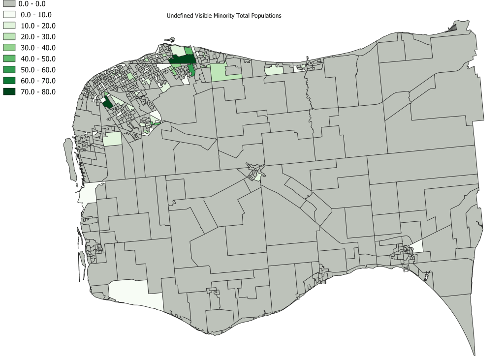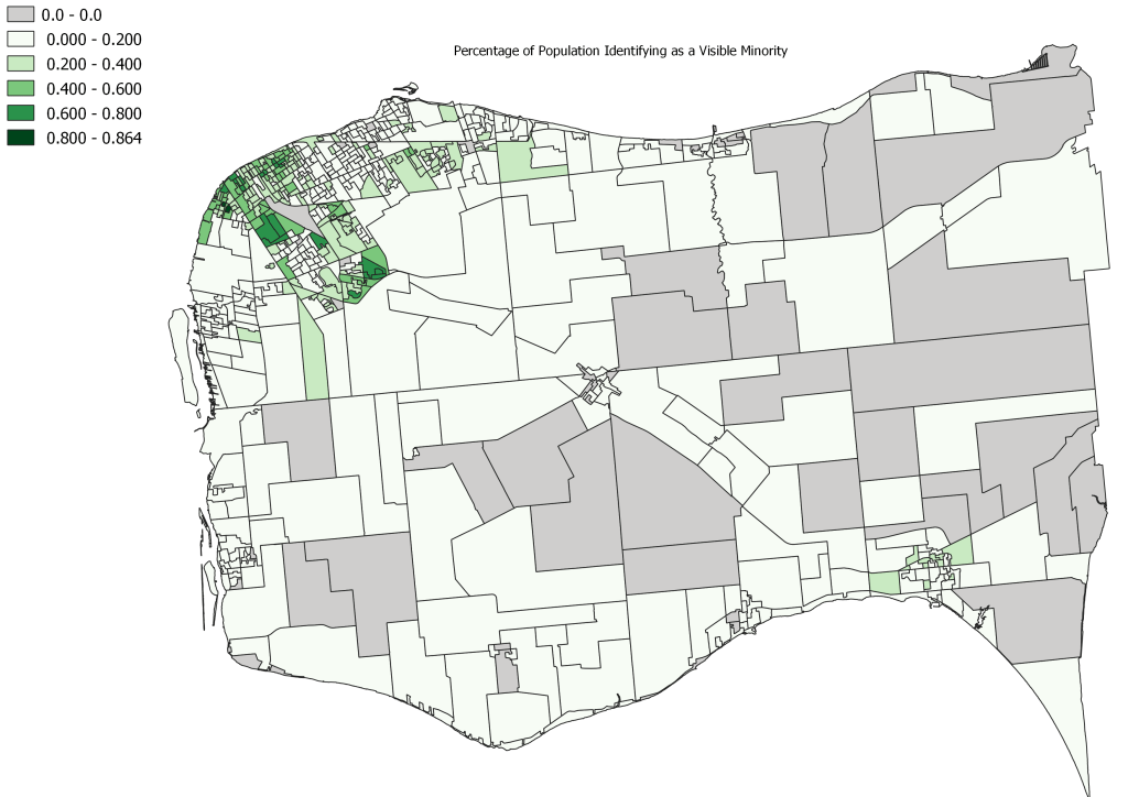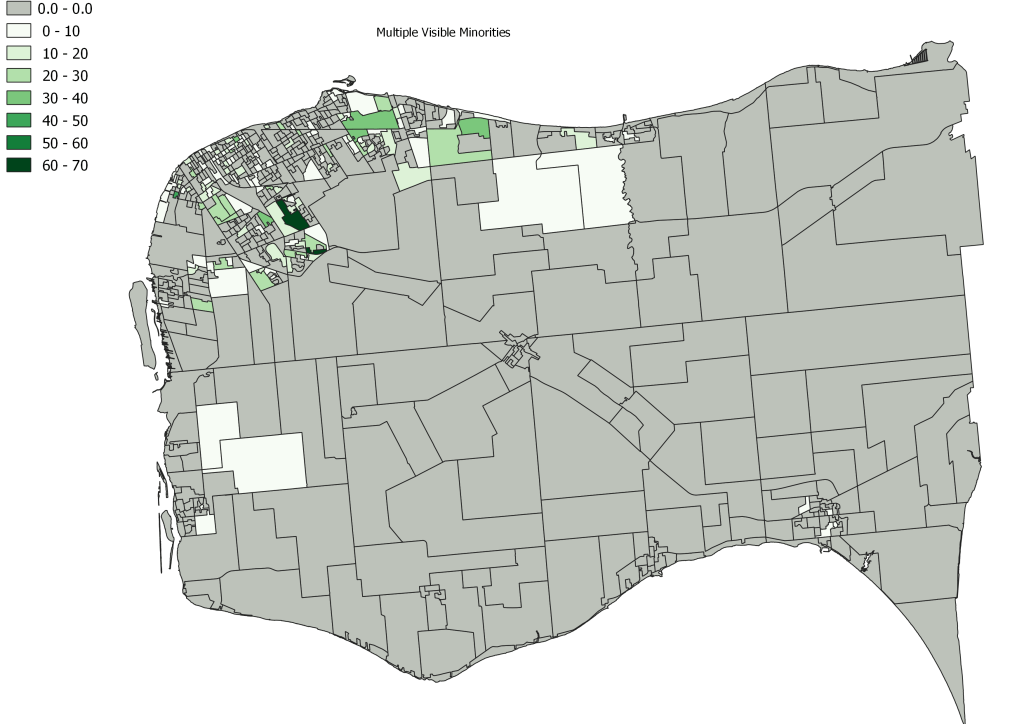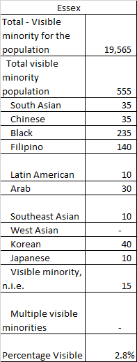 - We are fortunate, unlike Toronto, where there are clearly defined racialized communities, areas where visible minorities reside in Essex County tend to multi-ethnic particularly the large Census DAs outlined above.