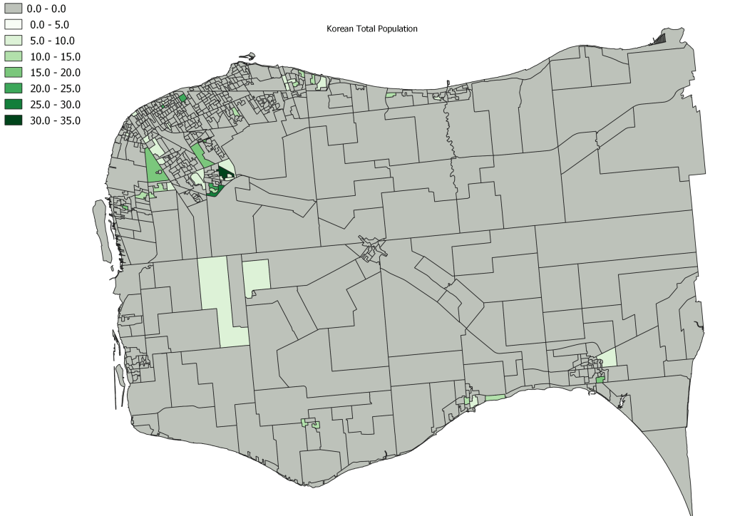 I am not going to dig into the specifics of each map. I will note that the scales do change map to map, as in some cases like with the Korean population 35 people are the largest group in a specific DA in Essex County, compared to 650 South Asians living in a single DA. I will leave that for readers to work through and explore but I highlight a few things: