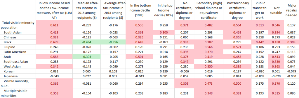 [Author Update: In completing the piece on Indigenous Populations to follow this one I found that the original labeling on this table that stated white populations, was not totally accurate as non-visible minorities (which the data category is called) does include non-white populations like aboriginal or other groups who do not fit the Employment Equity Act categorizations. The chart above has been re-labeled but no other changes to the piece have occurred as the correlations and outcomes illustrated in the data are largely driven by white people.]