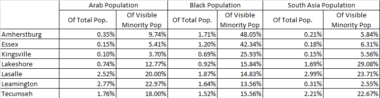 As Arab, Black and South Asian communities represent almost 2/3 of all visible minorities population in Essex County. Their population drive most representation in our region.