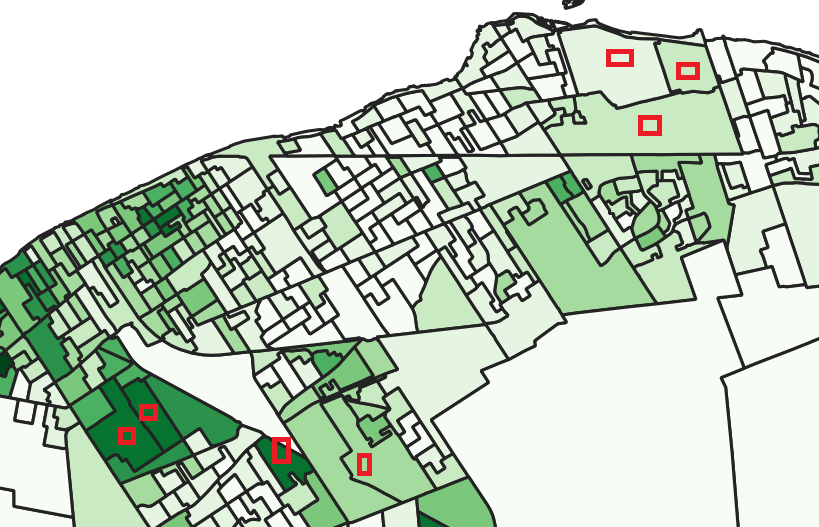 The relationship isn’t nearly as clear between school outcomes and race. Give the varying sizes of school catchments and overlapping school districts it is difficult to say if the kids in a neighbourhood actual go to their neighbourhood school. That being said, the schools with some of the lowest test scores do have catchments that pull from some of the most racially diverse communities in Windsor. Based on the correlations above, it is likely that Black kids might be more at risk than a white kid out of the same neighbourhood.