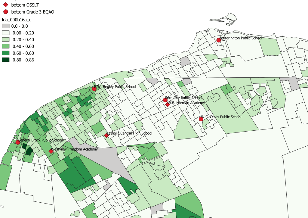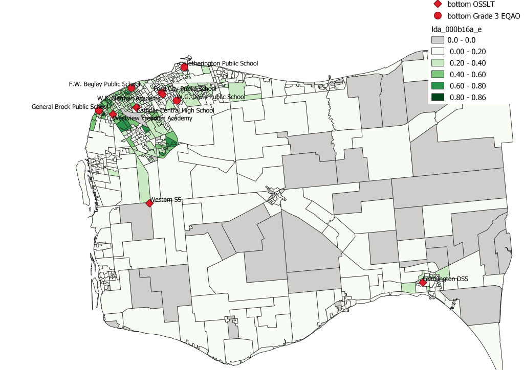Two primary outliers are Western Secondary and Hetherington Public School. In the case of Hetherington, it does pull from the dissemination areas that are over sized in East Windsor so despite the lower percentage of visible minorities, the total number of the catchment is inflated. Western Secondary, pulls from almost half the county and it’s poor literacy test scores are tough to tie to racialized populations given the lack of diversity in those communities.