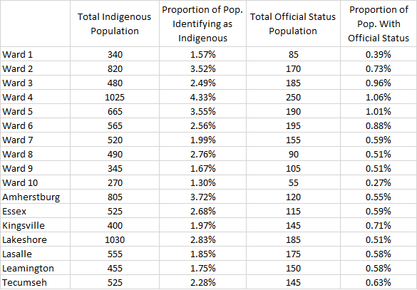 Overall there are approximately 9,800 individuals who identify as Indigenous in Essex County representing about 2.51% of the population. In the context of other visible minorities this would be the 4th large non-white group in Essex County (behind Arabs, South Asians and Black populations respectively). The official treaty status population is naturally smaller subset population with only about 2,300 individuals representing less than one percent of the overall population (0.65%). Broken down by community and City ward it looks like this:
