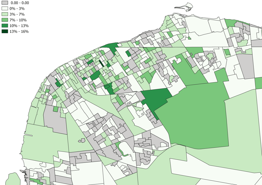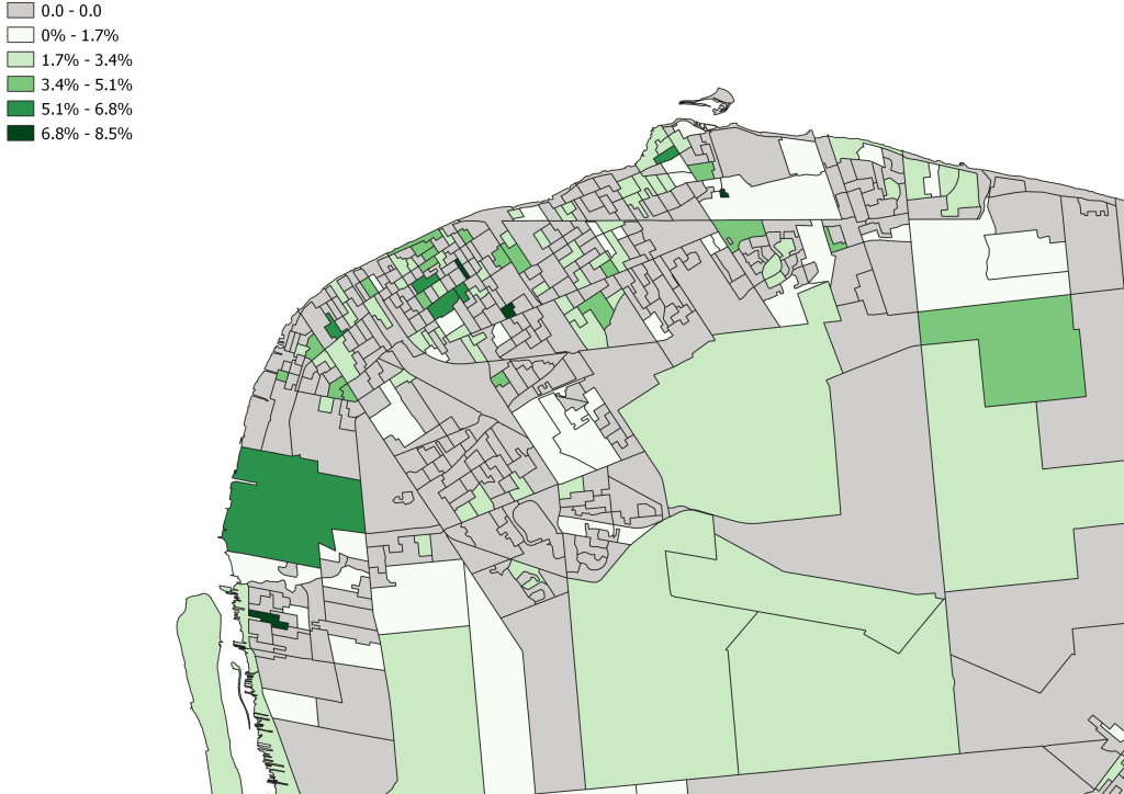 Despite being about the 4th largest population in Essex County Indigenous populations seem to be more disbursed across the region. Arabs for example make up almost 7.6% of Windsor population and over 16% of the population in Ward 10. It is somewhat surprising the Lakeshore seems to be home to most more self-identified Indigenous People closely followed by Ward 4 in Windsor. Given the socio-economic make up of these communities (particularly the high concentration areas in Ward 4) these generally speaking are not low-income communities which people would generally equate to indigenous populations. When we map this data, here is what we find: