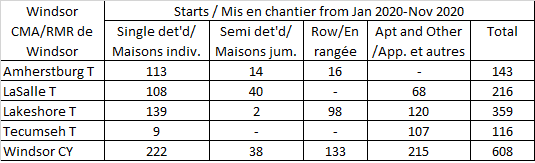 - Beyond Windsor if you are wondering how housing starts went for 2020, he is your Jan-Nov totals for the members of the CMA. Decembers numbers are available mid-January.