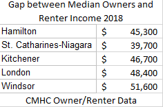 - As the chart below illustrates, Windsor in 2018 had the largest gap between renter and owner incomes for SW Ontario CMAs.