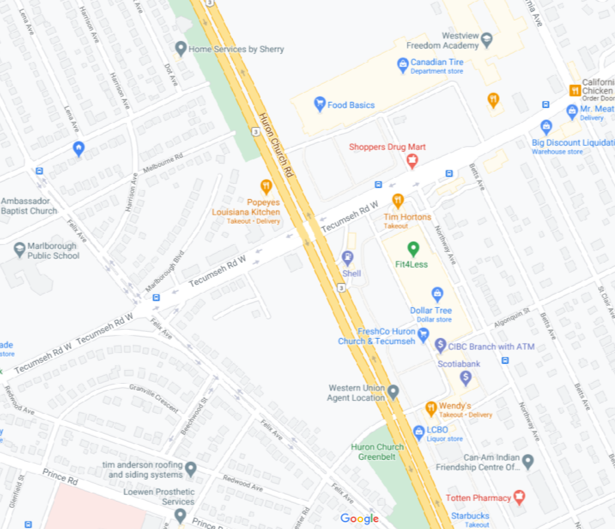- The second point is that this plot of land has been a unofficial link in the Huron Church Greenbelt for a long time. For those that don’t know, the Huron Church Greenbelt is a part of the City park system. The Parkland runs from Millen St. to just North of the Popeyes Chicken, then starts again South of Dorchester Rd to Prince Rd.