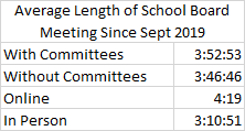 - Tuesday night’s meeting was actually 3 meetings – Education committee, Finance and Op. committee and the full board meeting. The fact that three meetings all happen in one night is weird to me.