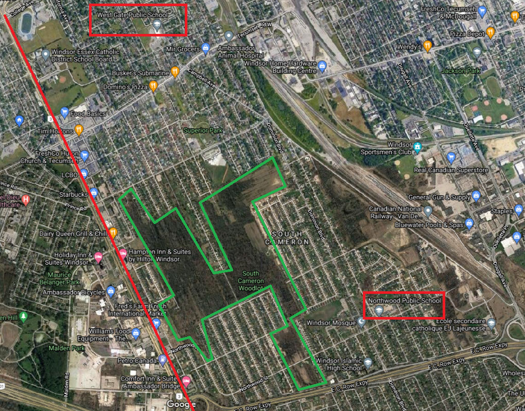- Given that both West Gate and Northwood (Red Squares) only service East of HCR (red line). The green line is the happy fun space that is the South Cameron Woodlot – that is or isn’t environmentally sensitive depending on who you ask. Development may come to that space but the question is does the school board wish to take that risk?