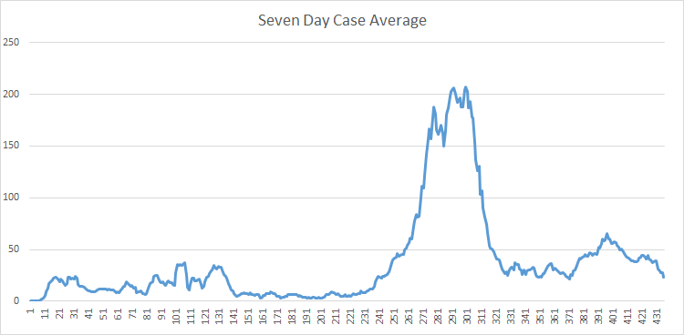 - Our 7 day rolling average of cases is now 22.85 cases per day. The last time it was that low was March 25 at 21.64 cases, and before that was November 16th of last year at 22 cases. A hopeful sign!