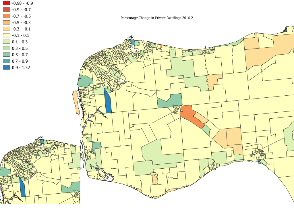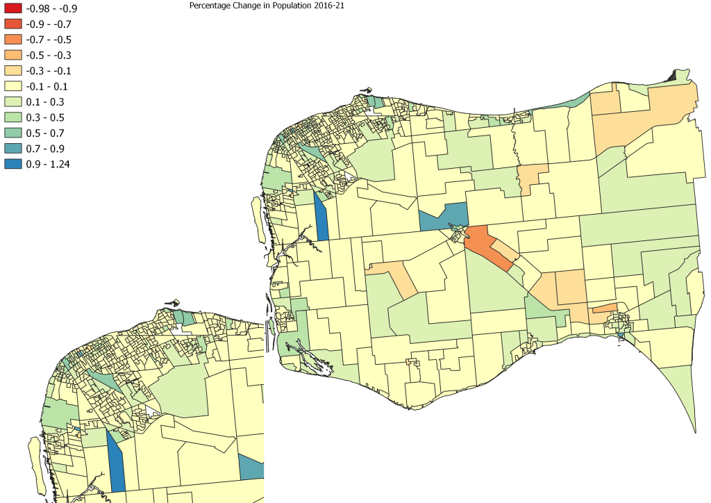 A 10% change +/- is not a significant swing and that accounts for most of the County’s DAs (Yellow color -/+10%). Most of the population declines occurred in rural parts of Essex County while Lasalle see the highest growing DA with the area of Heritage Estate growing at over 124%. The one that shrank by almost 98% is a tiny little DA that shouldn’t exist and I have no why it is there