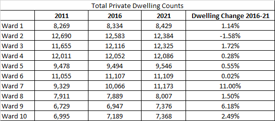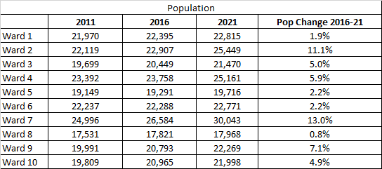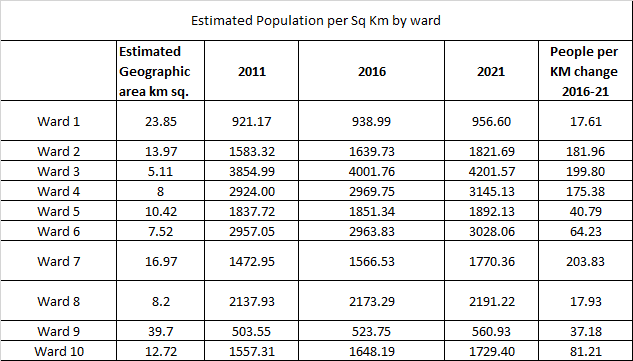 Overall the core Wards (2-6) were outgrown by the suburban wards as Wards (1 & 7-10) which now have approximately 1,000 more residents, compared to 2016 where the gap was only a few hundred different.