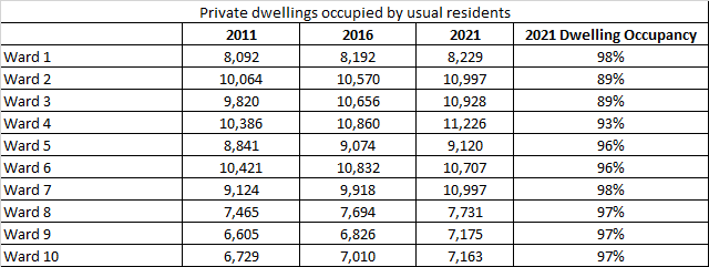 I suspect both Wards 2 and 3 have lower occupancy rates for different reasons. Ward 3 is home to most of the city’s hotels while Ward 2 has a number of boarded up homes, students residences etc. that are technically dwellings, but not regularly inhabited. I don’t really know why Ward 4 is a bit lower, it is weird to me – maybe we need to let people move into Willstead Manor?