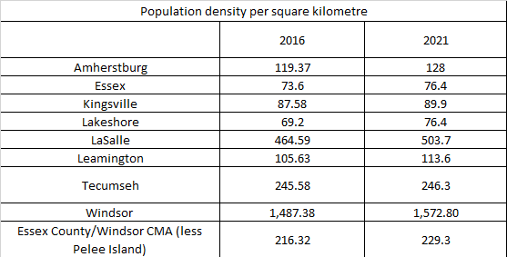 At some point in the future I will breakout the population density of the urban areas of the County municipalities. At the time of 2016 Census in many cases they were more dense than parts of Windsor and since no DA were added to the county their population increases we be captured by historic boundaries. Within the City we see: