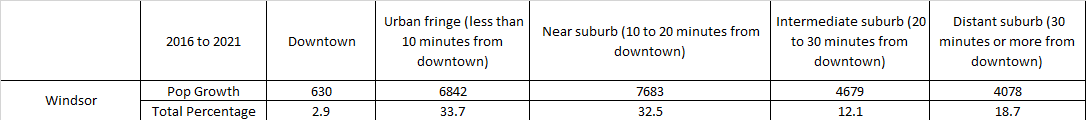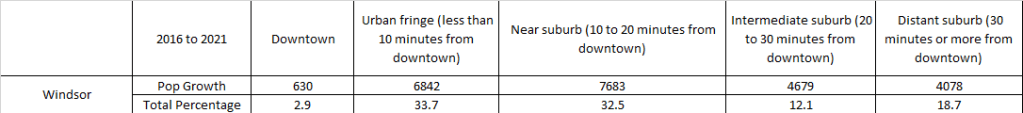 The last piece of data that released was related to urban centres growing. Unfortunately this data is only available at the NEW Windsor CMA -so all of Essex County. They tracked where population growth was occurring urban areas – downtown, downtown fringe, near suburb, intermediate suburb or distant suburb. By their definition they use employment data to determine where a downtown is, then they measure outwards from that geography. The results for the Windsor CMA are as follows: