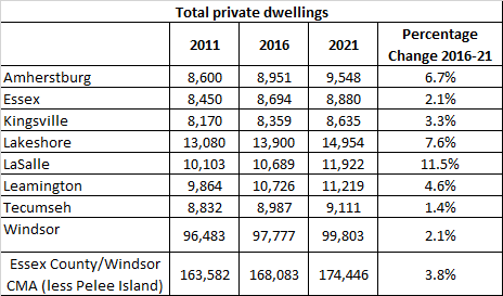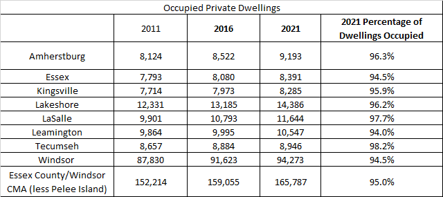 I don’t think there is a sweet spot or anything around occupied dwellings. Leamington having a low regularly occupied dwelling count could have to do with bunk housing in the greenhouse/agricultural sector. Tecumseh’s high dwelling occupancy could be contributing to it’s slower growth. Within the City we find.
