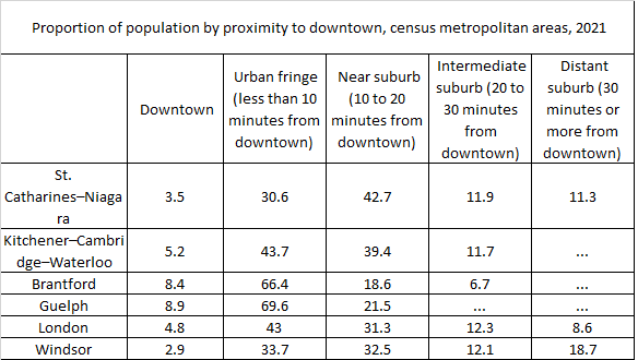 There are a few takeaways to consider. I think the takeaway from this is that Windsor CMA is by far the least urban dense region in SW Ontario. Even in the innermost ring of “urban fringe” sees a smaller share of the population compared to all other communities except St. Catharines/Niagara.
