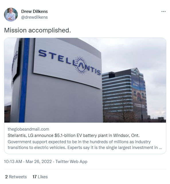 $4.5+ Billion, 2,500 jobs, largest investment in the auto sector in Canadian history, a reported 4:1 expected spinoffs is nothing to shake a stick at. Although we can (and will) pull apart these numbers a bit, this is a transformative investment for Windsor and Essex County. From a marketing perspective it certainly puts us on the maps for EVs production. The supply chain (likely provided by CN Rail via their lines to the site) that will flow here will support broader diversification efforts wile the forthcoming Gordie Howe International Bridge will mean that there will be redundant access to the US markets. Congratulations to the Mayor, Council, InvestWE, Provincial and Federal Officials and everyone involved!