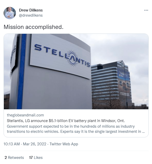 I have been thinking about how to frame this plant in a traditional automotive eco-system. Is it an OEM tier facility; Tier 1 part supplier, or something else. To me, despite Stellantis’ name being attached, this is a joint venture and from my understanding, employees of the eventual battery plant will work for LG not the automaker. This distinction has created tensions in the US where the UAW is battling with a GM/LG partnership because it means that plant workers at the joint venture do not receive top rate comparable to assembly workers. Companies have said that top union rates are not competitive in the battery ecosystem and following the announcement of the Lordstown plant in 2019, GM CEO Mary Barra indicated that workers would be paid less than top union wages in order to remain cost-competitive. Based on US pay scales we are talking $10,000 – $20,000 per year differences in pay. That gap if it occurs in our community will be a big deal, and will probably be a point of contention when both Canada and the US auto unions negotiate in 2023.