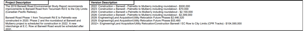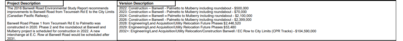 The question becomes do you pull forward the future phases of the project sooner than the city was planning? The work to be done before 2026 was largely north of EC Row, not necessarily the priority to support the plant but would improve local traffic flow north of EC Row. Meanwhile the $100 million price tag is for a full overpass at Banwell Rd. to replace the current stoplight. It is unlikely this work will be done before the 2024 opening date but it becomes a major ticket item that needs to be built with this and other development coming.
