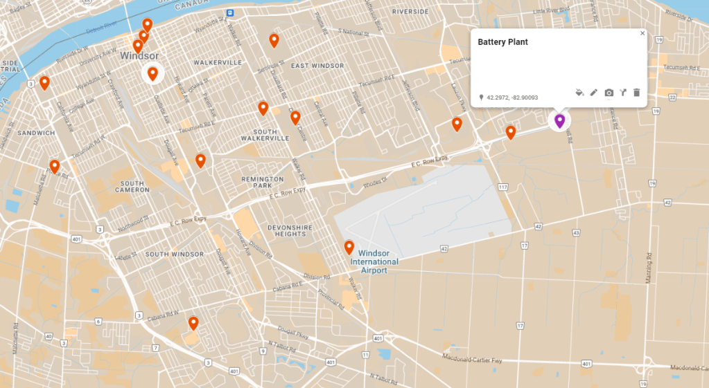 The location of this plant shifts the economic centre of the city to the south and east. Depending on your point of view this could be a good or bad thing. The map below shows the 10 largest employer locations in the City of Windsor and the new Battery plant.