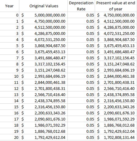 I am not an accountant, but I do like playing around with numbers. The chart below shows the depreciation of a building at the 5% rate which is one of the rates that CRA allows. This is before the federal incentive program that allows additional capital allocation deductions. I get that the total investment isn’t just the building but I want to point out that any business can claim depreciate of capital assets against their tax liabilities as a part of doing business.