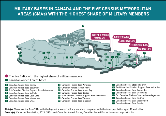 Veterans made up 1.5% of the total population aged 17 and older in 2021. Belleville–Quinte West (4.5%), Halifax (4.4%), Kingston (4.0%), Fredericton (3.8%) and Saint John (3.5%) had the highest share of Veterans among the total population aged 17 and older within Canada’s CMAs.