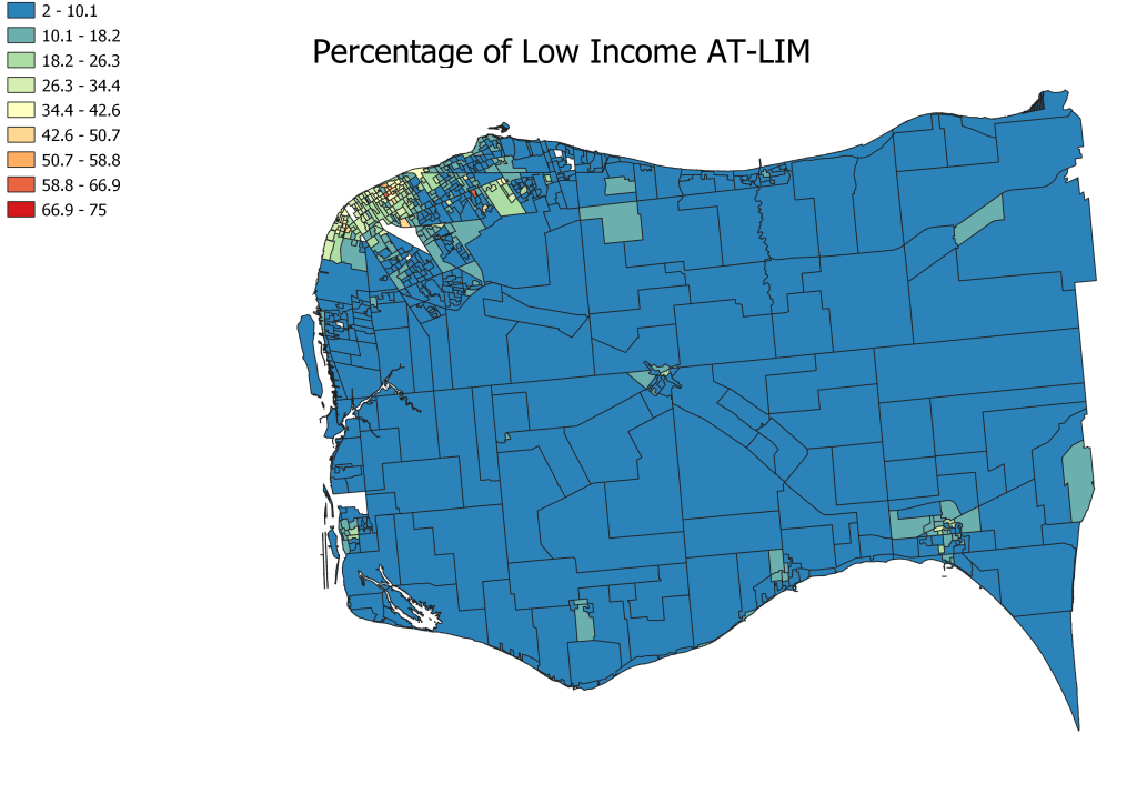 Although Canada is a relatively equal country particular compared to the US and others the fact that Windsor CMA (which now represents all of Essex County) as a mid-size region ranks 5th most unequal community in the country is shocking. There are likely a lot of reasons for this which may become clearer with future census releases but you can certainly look at the disruption in the auto sector of the last decade playing a role. When incomes declined between 2006-2016 they did not decline equally they declined for the bottom than the top. This obviously bridges into low income rates which are negatively correlated with the median household incomes.