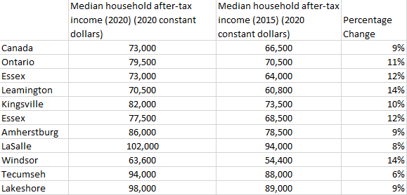 Despite improvements in low income rates since the 2016 Census a big peace of that was COVID income support. In fact Essex County, was a net benefiter due to COVID supports. In 2019 Median individual income was $38,000 and in 2020 it was 40,000 – yet median market income (incomes from wages, salaries or other employment) fell from $35,600 to $33,200. At the same time median government transfers grew from $3,960 in 2019 to $10,100 in 2020. This government transfer growth represents a 6.3% increase in income share in our community. After taxes in 2020 median individual incomes went up to $36,400 from $34,800 in 2019.