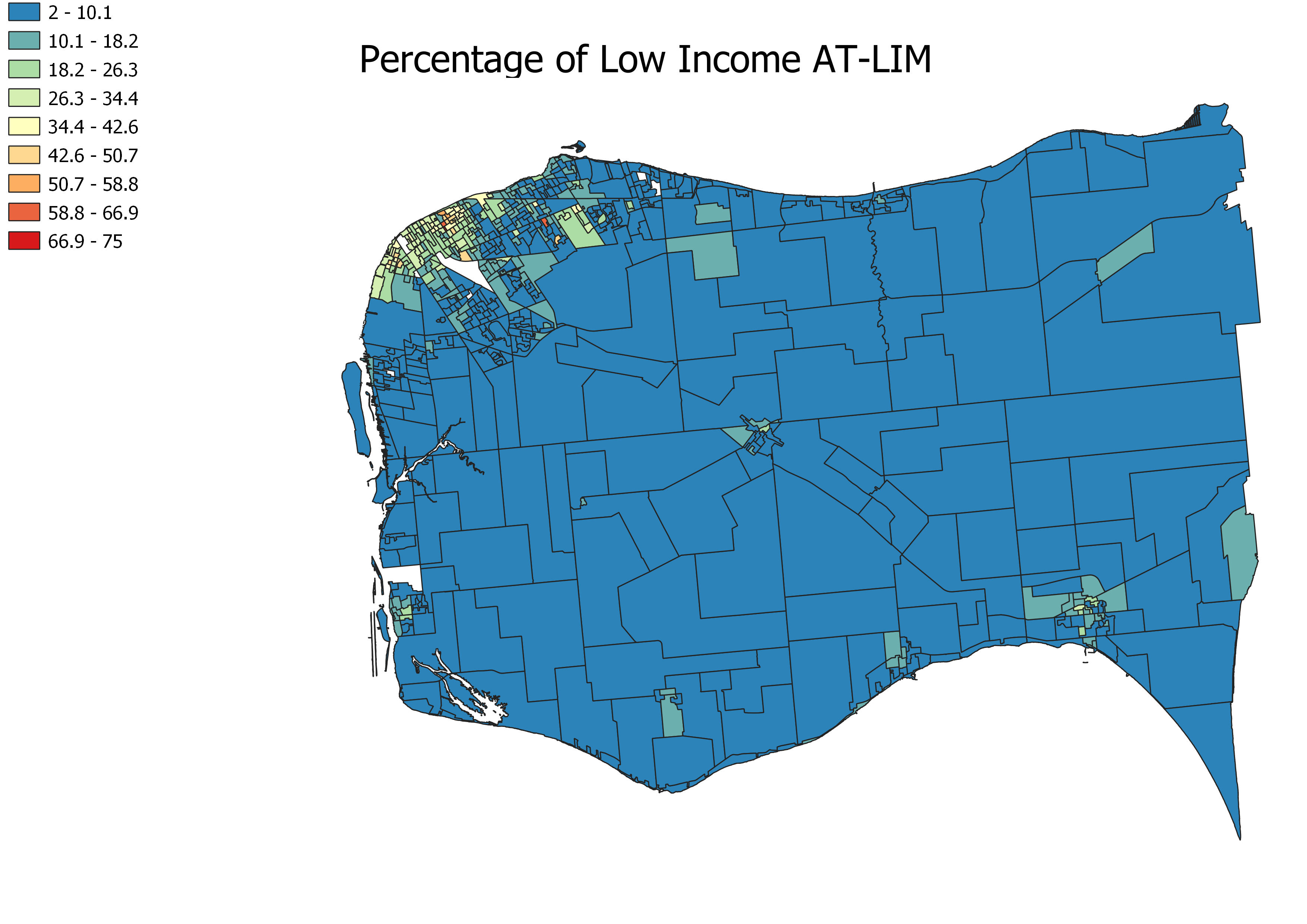 Although Canada is a relatively equal country particular compared to the US and others the fact that Windsor CMA (which now represents all of Essex County) as a mid-size region ranks 5th most unequal community in the country is shocking. There are likely a lot of reasons for this which may become clearer with future census releases but you can certainly look at the disruption in the auto sector of the last decade playing a role. When incomes declined between 2006-2016 they did not decline equally they declined for the bottom than the top. This obviously bridges into low income rates which are negatively correlated with the median household incomes.