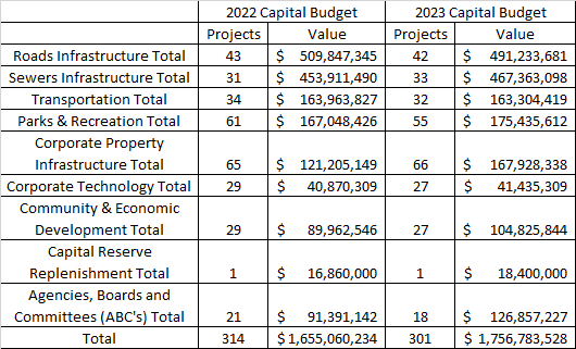Overall the capital budget breaks down like this, I included the 2022 proposed capital budget for comparative purposes.